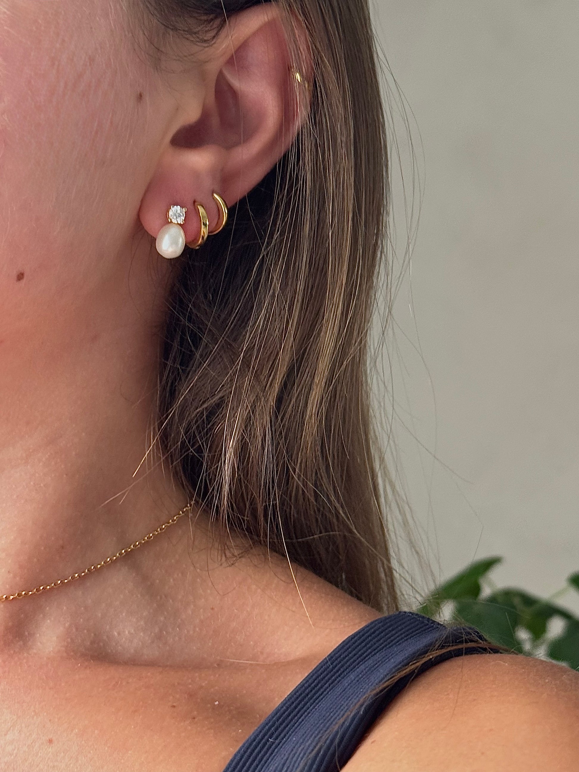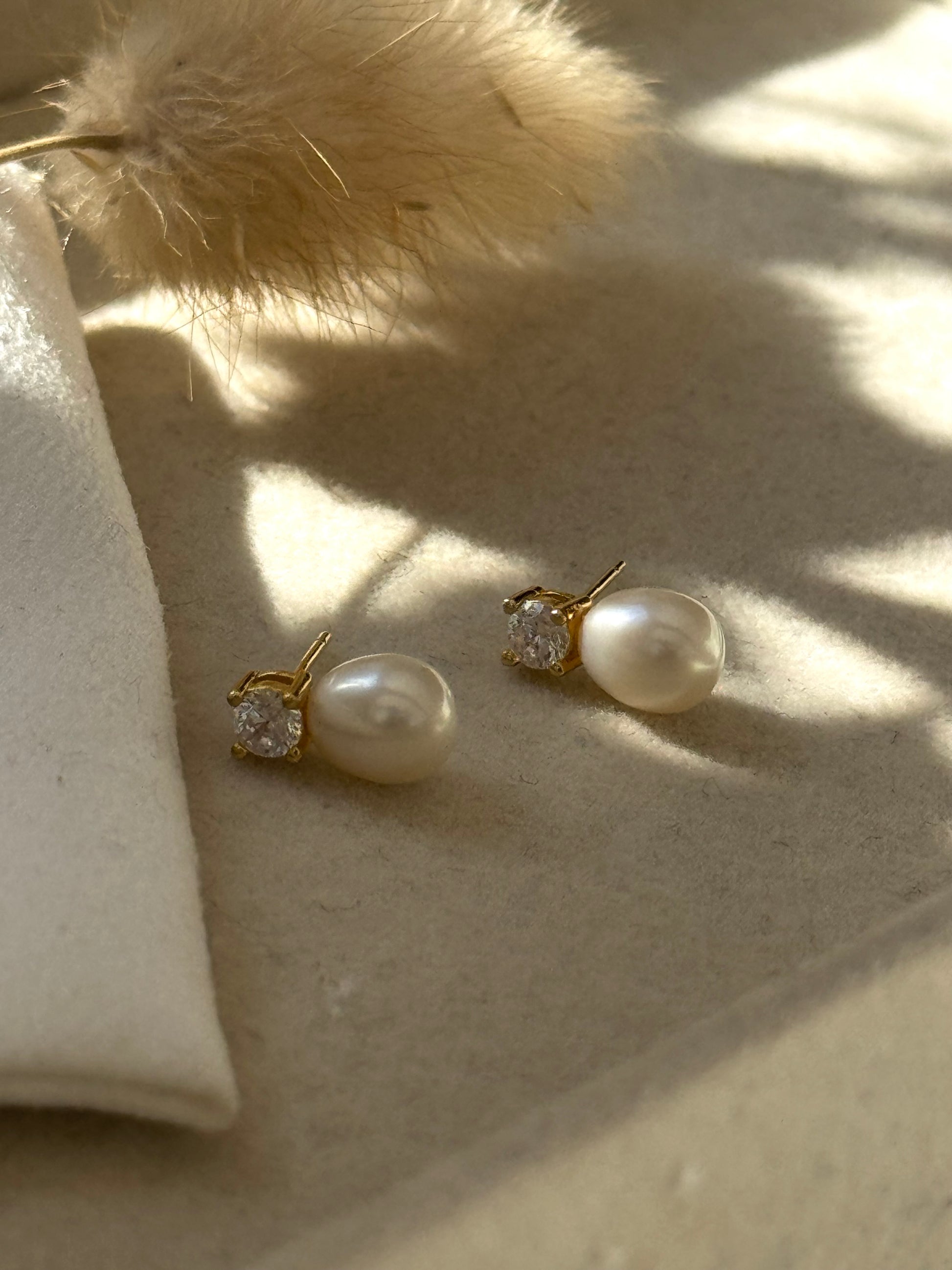 עגילי כסף 925 מצופה זהב 14K בעבודת יד, בשילוב פנינה מתורבתת איכותית.